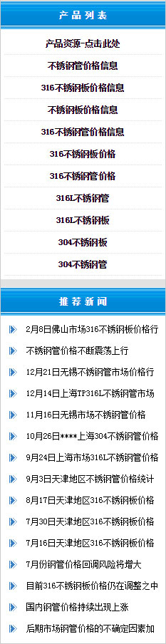 主營(yíng)品種:不銹鋼管,不銹鋼板,不銹鋼棒,不銹鋼卷板,不銹鋼管件,不銹鋼方管,材質(zhì)為304,304L,316,316L,321,310S,309,2520,2205,904l其中304不銹鋼板,304不銹鋼管,316不銹鋼管,316不銹鋼板長(zhǎng)期有現(xiàn)貨供應(yīng),同時(shí)提供316不銹鋼板價(jià)格和不銹鋼管價(jià)格的價(jià)格資訊!